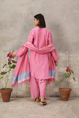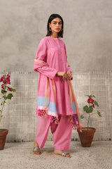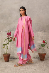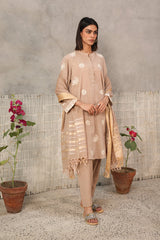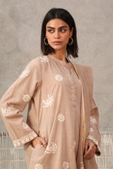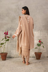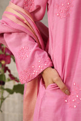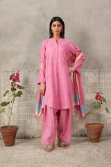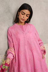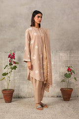 A straight-fit delicately embroidered kurta featuring a band neckline and buttoned front placket. The kurta is adorned with Gul o Mahtab motifs, enhanced with intricate aina work. The sleeve hems showcase fine embroidered details. Paired with a solid-hued dupatta, finished with gold denier borders and loose thread accents.