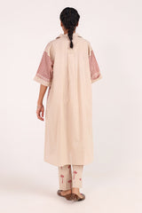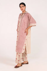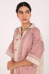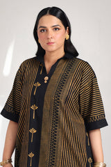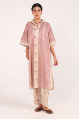A block-printed classic-fit kurta featuring a band collar neckline with a V-slit, adorned with button detailing. The artisanal block print lends heritage charm and visual depth to the piece. Paired with contrast-printed straight-fit trousers for a look that blends tradition with contemporary flair.