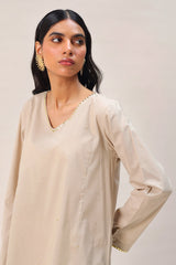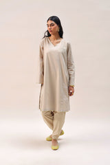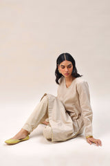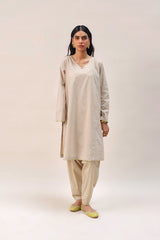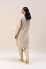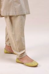 A loose fit panelled shirt with V neckline, adorned with mukaish detailing on the neckline and sleeves and all over. Paired with a foil printed pegged shalwar for a truly regal look.