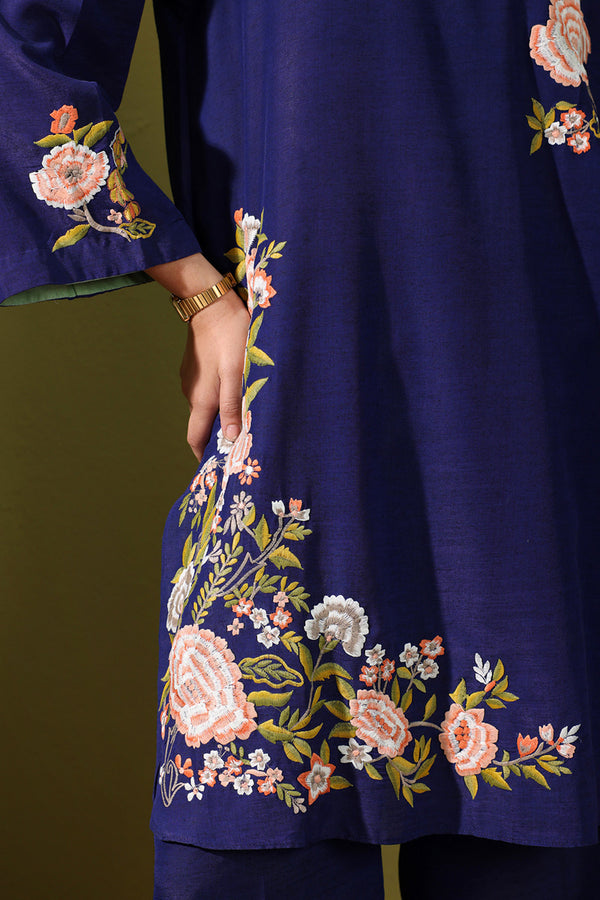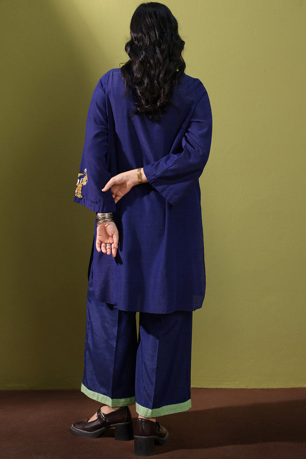 A solid co-ord set features a shirt with a band collar neckline and buttons along the front slit. The neckline and shirt hem are adorned with subtle gathering details, adding a stylish touch. It is paired with solid culottes, complete with pockets for added comfort and style.
