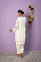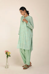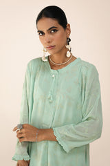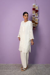 A classic fit self-embroidered kurta featuring a round neckline adorned with tassel detailing on the front placket. The gathered sleeve hems add a touch of volume, while delicate lace trim enhances the flare. Paired with a solid-hued classic fit shalwar, detailed with refined stitching at the ankle hemline.