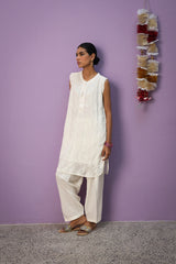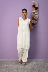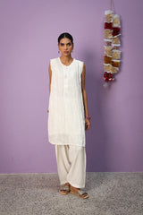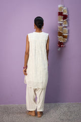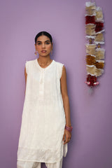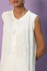 A self-embroidered kurta featuring a round neckline and delicate tassel detailing along the front placket. The shoulders are adorned with gathered lace-trimmed flare, adding a graceful touch to the sleeveless silhouette. Paired with a solid-hued classic-fit shalwar, enhanced with intricate stitching details along the ankle hemline, this ensemble blends tradition with understated style.