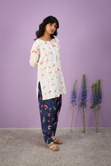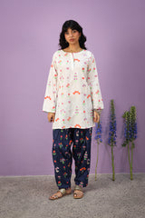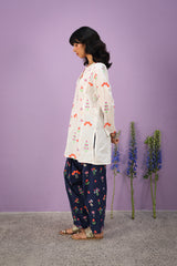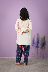 A classic straight-fit paneled kurta, adorned with vibrant Gul Bahar embroidered motifs. The round neckline and placket feature colorful lace detailing with delicate buttons, while the sleeve hems are trimmed with intricate lace. A fusion of elegance and charm. Paired with a contrast embroidered shalwar for a refined look.