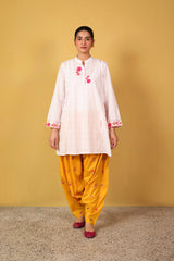 A classic-fit paneled kurta with a band neckline, adorned with delicate stitching and floral embroidered motifs on the front placket . Vibrant stitching enhances the panels, while embroidered sleeves and side pockets add charm. Paired with a floral-embroidered cowled shalwar for a chic look.
