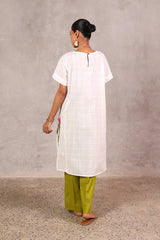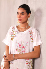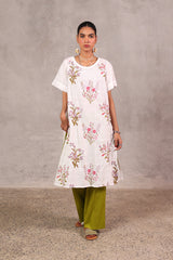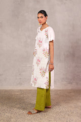 A floral embroidered kurta featuring a round neckline, adorned with delicate lace trim along the neck and sleeve hems. The lively, colorful floral motifs add vibrancy and charm to the overall look. Paired with solid-hued culottes for a balanced and elegant finish.
