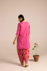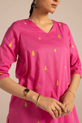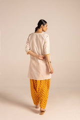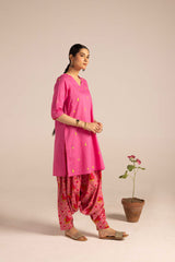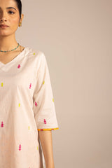 A classic-fit embroidered textured kurta featuring a V-neckline. The kurta is adorned with delicate embroidered motifs throughout, adding intricate charm. Paired with contrast-printed cowled shalwar, this ensemble offers a perfect blend of elegance and modern style.