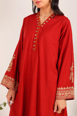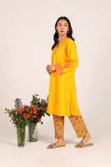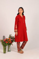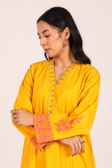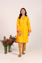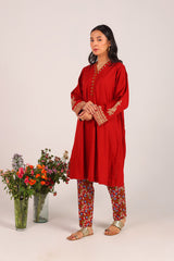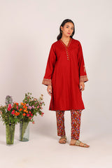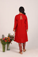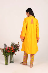 A relaxed-fit, paneled embroidered shirt with a V-neckline, adorned with delicate embroidery and a touch of sequins, finished with fish-stitch detailing along the neckline and placket. Fine embroidery graces the back and sleeves, elevated by contrasting printed piping. Paired with vibrant floral-printed straight-fit trousers for a striking and captivating look.