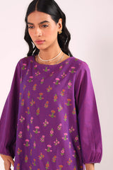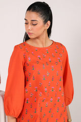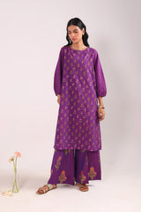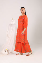 A floral block-printed, classic-fit kurta featuring a round neckline adorned with subtle stitching details. The cinched sleeves echo the same delicate stitching for a cohesive finish. Paired with contrast-block printed culottes for a balanced, stylish look.