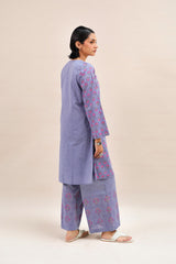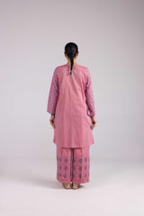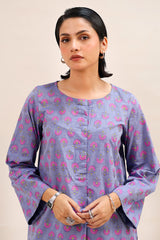 A hand-block printed shirt with a round neckline, paired effortlessly with contrasting printed culottes for a striking and harmonious look.