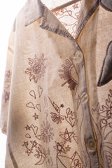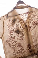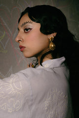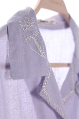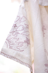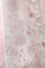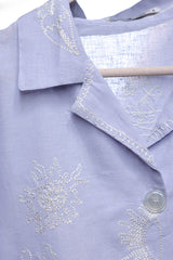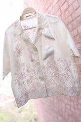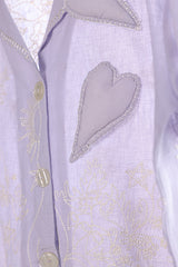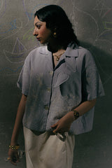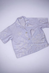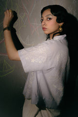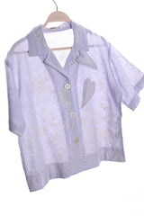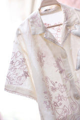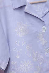 An embroidered short top with a collar and button-down placket. Finished with a handcrafted heart hanging, made with love, it brings a playful touch with a modern twist, blending artisanal detail seamlessly into everyday wear.