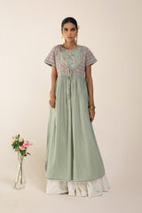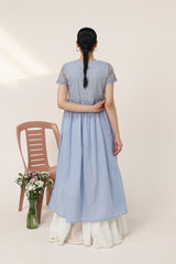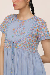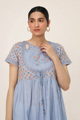 A handcrafted Anarkali frock in iconic Multani blues, featuring a koti-style bodice with pastel-hued embroidery and tassel accents. The pastel gul motif adds charm, while embroidered sleeves and gota trims refine the look. The empire waist gathers into a breezy flare, making it a timeless statement piece.
