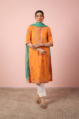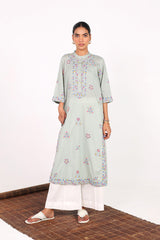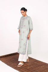 A classic-fit handcrafted kurta featuring a band neckline and buttoned front placket. It is adorned with colorful hand embroidery on the neckline, placket, sleeves, and hemline. Delicate embroidered motifs are scattered throughout the kurta, enhancing its charm. Can be styled with any bottoms for a complete look.