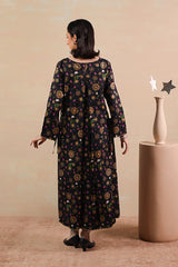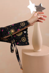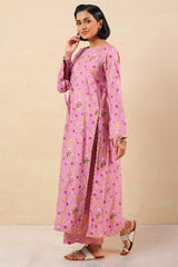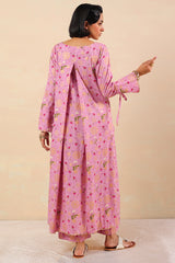 Gold printed long shirt with a boat neckline, scalloped sleeve hems, side slits, and a hem accented with delicate tilla scallops. Cuffed sleeves are adorned with tassels, while pleat detail at the back refines the silhouette. Paired with matching printed culottes, this ensemble exudes effortless comfort and style.
