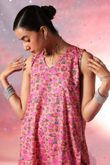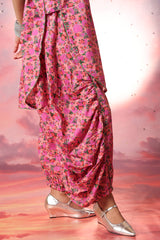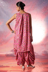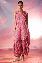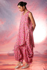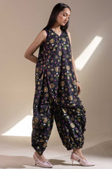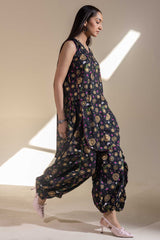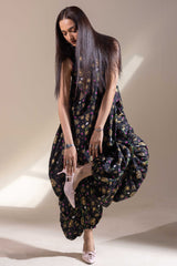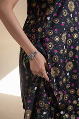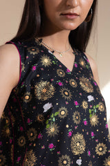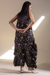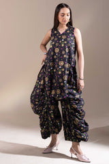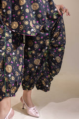 Luxurious gold-printed shirt with a V-neckline and loop design detail. Features a rounded hem and gathers at the back. Paired with matching printed jasmine shalwar with gathered ankle hems.