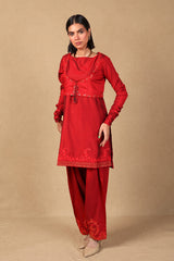 A fitted shirt with churidaar sleeves and boat neckline, along with a koti with exquisite embroidered detailing on the hems as well as tassels to tie at the front. The shirt features embroidered motifs and detailing at the shirt hem. Paired with a classixc fit shalwar with embroidered motifs on shalwar hems.