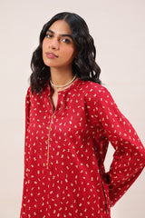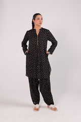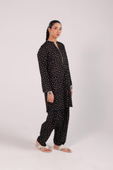 A printed shirt with a round neckline and V-slit, adorned with button detailing along the front slit. Paired with a matching printed classic-fit shalwar for a coordinated and effortless look.