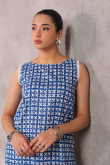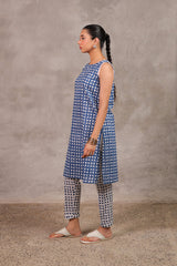 A classic-fit hand block printed shirt featuring a round neckline and lace trim on the sleeve hems. Paired with contrast printed straight-fit trousers for an effortlessly chic look.