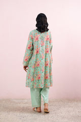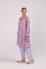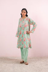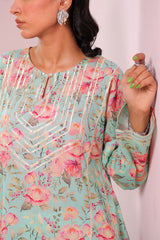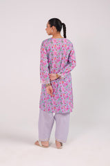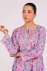 A printed paneled shirt styled with a round neckline and keyhole accent, finished with a delicate button. Gota lace trails along the bodice, sleeves, and panels, adding a subtle festive flair. Paired with a classic-fit shalwar featuring coordinating gota detail at the ankle hem.