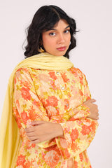 A floral-printed paneled shirt with buttons on the front placket, styled with a checkered lawn dupatta. Paired with a matching printed classic-fit shalwar.