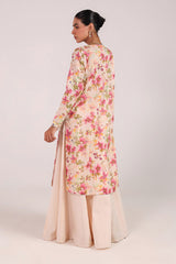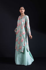 A printed shirt with a round neckline, adorned with loop button detailing on the front slit. Finished with gota lace on the neckline and sleeve hems. Paired with a sharara featuring lace trim.