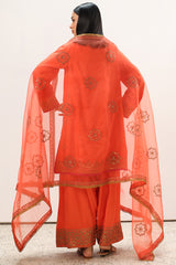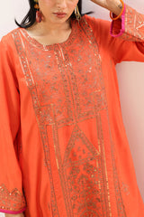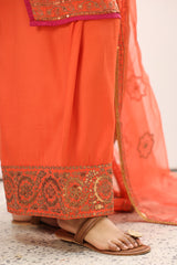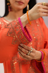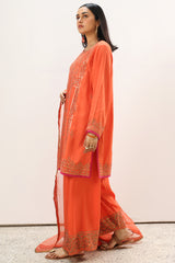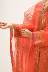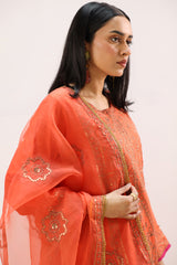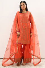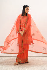 Embroidered classic-fit shirt adorned with delicate threadwork, enhanced with subtle sequin accents. Paired with a classic farshi shalwar featuring detailed borders. Styled with a sheer organza dupatta with coordinating embroidery, finished with lace-trimmed edges.