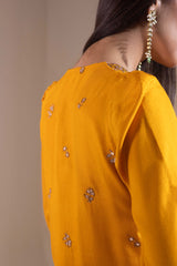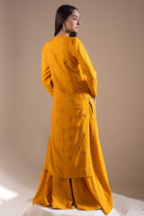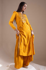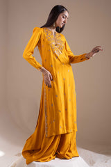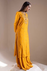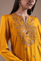 Classic-fit embroidered straight shirt with a round neckline and V-slit, adorned with tassel detailing. Delicate embroidery enhanced with sequin work adds a festive charm. Finished with puff sleeves and paired with a flared sharara for an celebratory look.