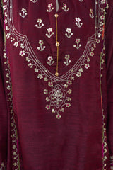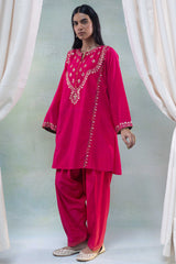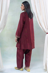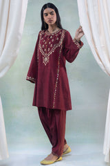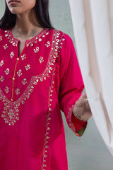 A hand-embroidered paneled kurta with a round neckline and V-slit, adorned with delicate thread and sequin work. The neckline is accented with golden dori detail, adding a touch of shimmer. Paired with a classic-fit shalwar featuring fine stitching along the ankle hemline.