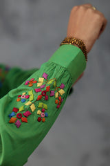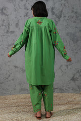 Hand-crafted classic-fit shirt featuring intricate patti work enhanced with aina detailing. Designed with a refined low band neckline and a subtle V-slit accentuated with mirror embellishment, finished with cuffed sleeve hems. Paired with a matching embroidered classic-fit shalwar.