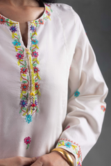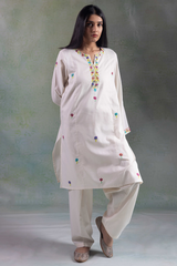 A classic-fit paneled shirt with a round neckline and V-slit, adorned with fun tassel detailing. The shirt is further enhanced with delicate all-over embroidery, paired with a classic-fit shalwar for a graceful, traditional look.