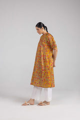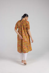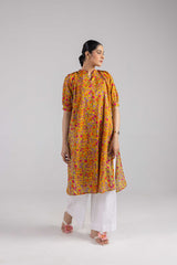 A paneled printed shirt featuring puffed sleeves finished with a cuff and a keyhole neckline adorned with quirky button detailing and a crochet trim. The back features pleated details on the neckline.