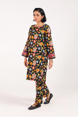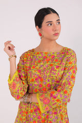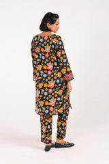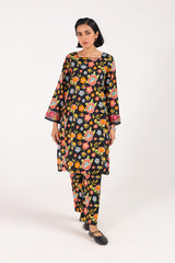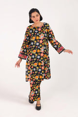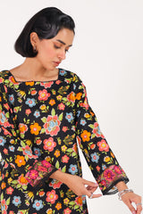 A printed paneled shirt with a square neckline, adorned with delicate lace trims along the neckline and panels. The sleeve borders are finished with embroidered details and lace trimming. Paired with matching straight-fit trousers.