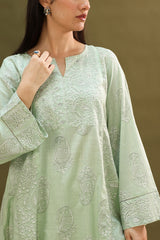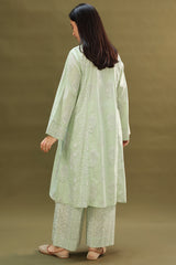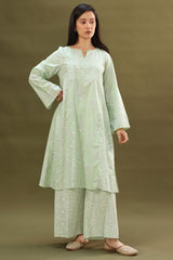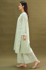 Classic-fit printed shirt with a round neckline and V-slit, adorned with subtle mukaish detailing on the bodice. Paired with coordinated printed culottes for a refined look.