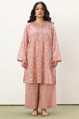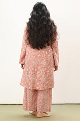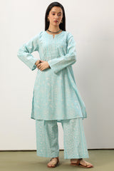 Classic-fit printed shirt with a round neckline and V-slit, delicately enhanced with mukaish detailing on the bodice. Styled with coordinated classic culottes for a refined, contemporary silhouette.