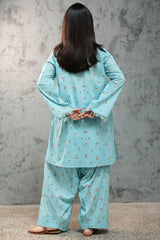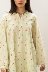 Floral-printed classic-fit shirt, enriched with soft fringe accents along the neckline and sleeve hems. Paired with a matching printed farshi shalwar for a refined finish.