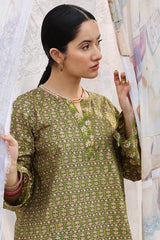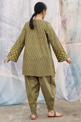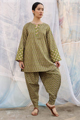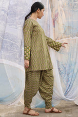 Classic-fit printed shirt with an overlap placket. Paired with a matching printed tulip shalwar for a balanced, contemporary look.
