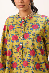 Floral printed relaxed-fit shirt with a low band neckline and buttoned front placket. Paired with a coordinated printed tulip shalwar for a cohesive look.