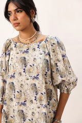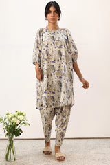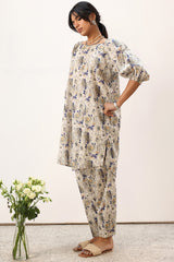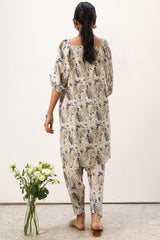 Soft floral printed boxy-fit shirt with puff sleeves, finished with cinched hems. Paired with a matching printed pegged shalwar, detailed with subtle stitching along the ankle hem.