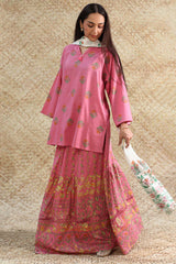 Relaxed-fit printed shirt with a round neckline and V-slit, adorned with tassel detailing. Paired with a coordinated printed long flared skirt, finished with soft gathers for added movement.