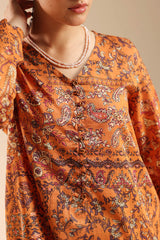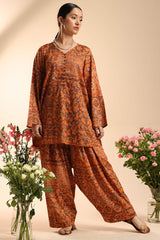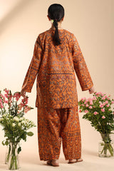 Printed classic-fit shirt with a V-neckline, refined with loop button detailing along the front slit. Paired with a matching printed farshi shalwar, finished with subtle border stitching.