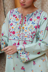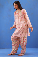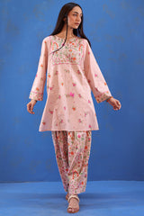 Floral-printed paneled shirt with a round neckline and V-slit, adorned with tassel detailing. Paired with a coordinated printed classic-fit shalwar.
