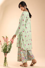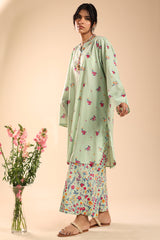 Printed classic-fit shirt with a round neckline and V-slit, adorned with delicate tassel detailing. Finished with a rounded shirt hem and subtle pleat detailing at the back. Paired with coordinated printed culottes.