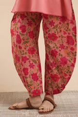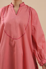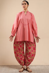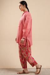 Classic-fit shirt with a low band neckline, finished with delicate stitching detail along the neckline, side slits, hemline, and cuffed sleeve hems. Designed with subtle drop shoulders, creating a relaxed yet refined silhouette. Paired with a floral-printed slouchy shalwar.
