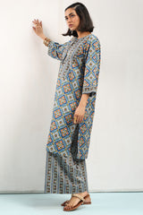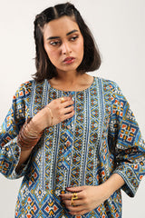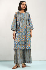 Classic-fit printed shirt with a round neckline and a buttoned front placket. Paired with coordinated printed culottes.