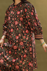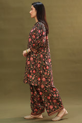 Classic-fit printed shirt with a keyhole neckline, adorned with scalloped lace detailing along the neckline and sleeve hems. Paired with matching printed farshi shalwar.