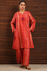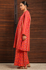 Classic-fit printed shirt with a round neckline and V-slit, adorned with tassel detailing. Finished with coin accents along the sleeve hems. Paired with matching printed culottes.