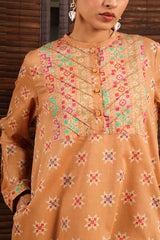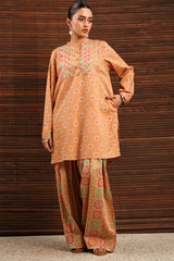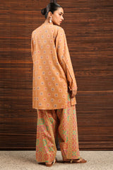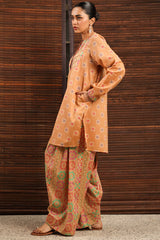 Printed classic-fit shirt with a low band neckline and a buttoned front placket. Designed with side pockets for ease. Paired with a coordinated printed farshi shalwar.