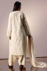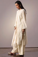 Embroidered classic-fit shirt crafted on a soft muslin mulmul base, with a keyhole neckline adorned with self-embroidery and appliqué work on the sleeve hems. Comes with an inner for added comfort and ease. Paired with a khula poncha shalwar and styled with yarn dyed dupatta.