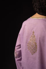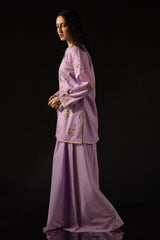 Hand-block printed classic-fit shirt with tassel detailing along the V-slit. Delicate gota detailing along the neckline, sleeve hems, and hemline, finished with a subtle sprinkle of mukaish accents. Paired with wide flared trousers.