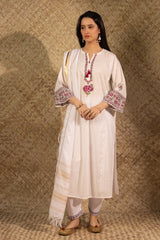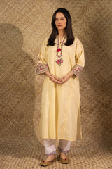 Hand-block printed classic-fit paneled shirt with a low band neckline and V-slit, adorned with tassel detailing. Paired with coordinated printed pegged shalwar.