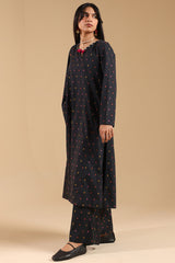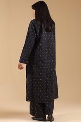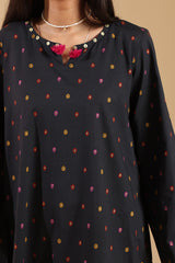 An A-line, gold-printed shirt with a round neckline and V-slit, adorned with delicate mirror work and tassel details. Paired with matching, printed culottes for a coordinated and stylish look.